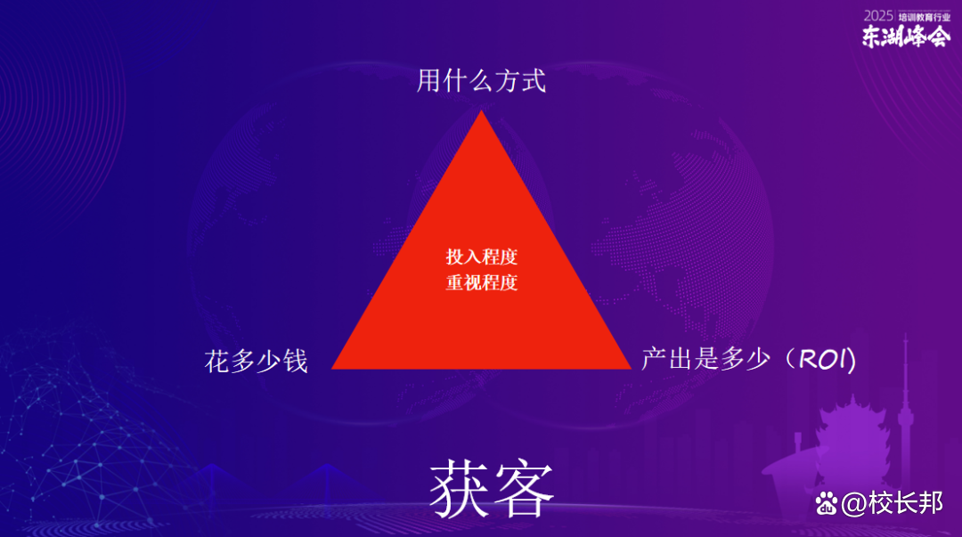 针对从业者最头痛的获客问题,裘杨强调,每一个教培人应该要牢记三件事。第一,从什么渠道获客;第二,获客要花多少钱;第三,钱花出去后能产出多少。“我们关注的ROI,每一次获客都基于你做决策时,是否对应考虑到这三件事。那么最终能否做好呢?核心在于你的投入程度和重视程度。”