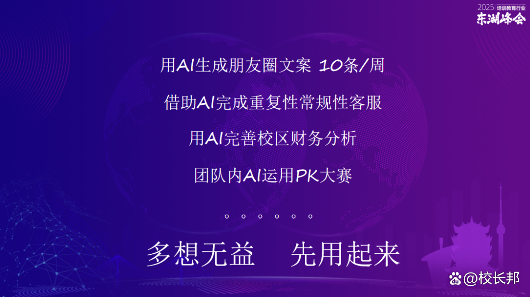 “AI跟我们有什么关系?”裘杨认为,教培企业不必盲目追求大规模部署AI,而是要从实际出发,将AI应用于日常工作的重复性常规动作。现场她分享了自己女儿的故事,“我女儿才19岁,她发现自己的班主任有很多重复性的工作,就花了4个小时把DeepSeek部署的相关视频看了一遍,接着自己编写了一个程序出来。”所以,对教培企业来说,完全可以用AI去解决日常工作,比如文案的生成,也可以在校区或团队内开展AI运用PK大赛,鼓激发团队学习和工作的积极性。