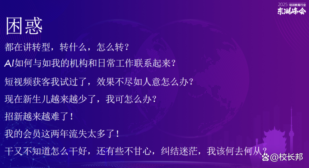 当前,很多教育同仁面临诸多困扰。比如对行业转型很迷茫,不知道该转什么、怎么转;面对AI等技术变革,不清楚怎么应用到自己的机构来;人人都要说要短视频获客,也都试了,效果还是不行啊;打开新闻一看,新生儿数量减少,招生更难了;以及有目共睹的,老会员流失严重等。既然这么难,为什么还要坚持在这个行业?答案就是情怀。裘杨认为,选择教育行业的初衷,是因为大家对教育有情怀,希望将热爱的事业作为自己的事业,通过教育成就自己和孩子,同时实现商业价值。