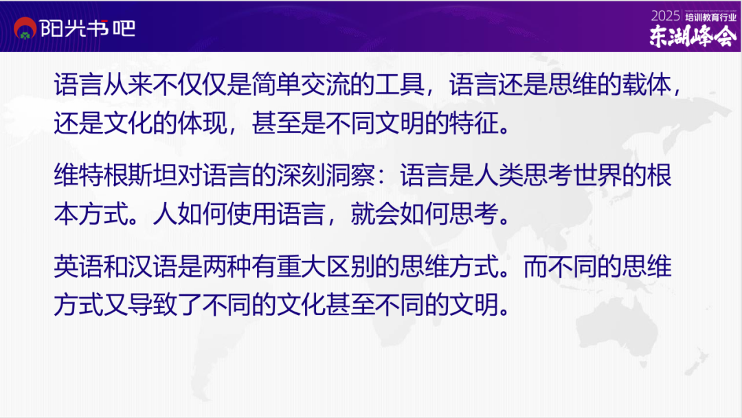 母语式思维:能够像母语为英语的孩子那样思考、认知。因为语言它从来不仅仅是简单的交流的工具,语言还是思维的载体,是文化的体现,甚至是不同文明的特征。