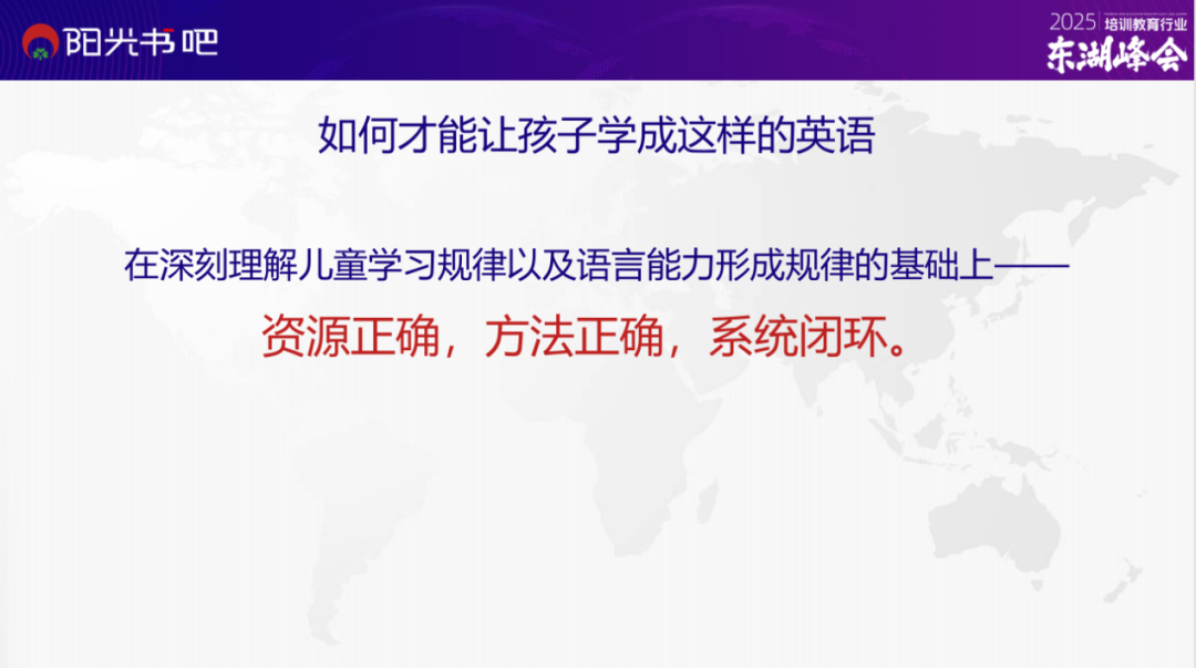关键在于我们在深刻理解了儿童语言学习规律以及语言能力形成规律的基础上,统合各个层面,使资源正确、方法正确,并形成系统闭环。我们没有把语言拆分成单词、语法等碎片化的知识去教授,而是为孩子们创造了一个良好的语言环境,让他们在自然的情境中学习语言。