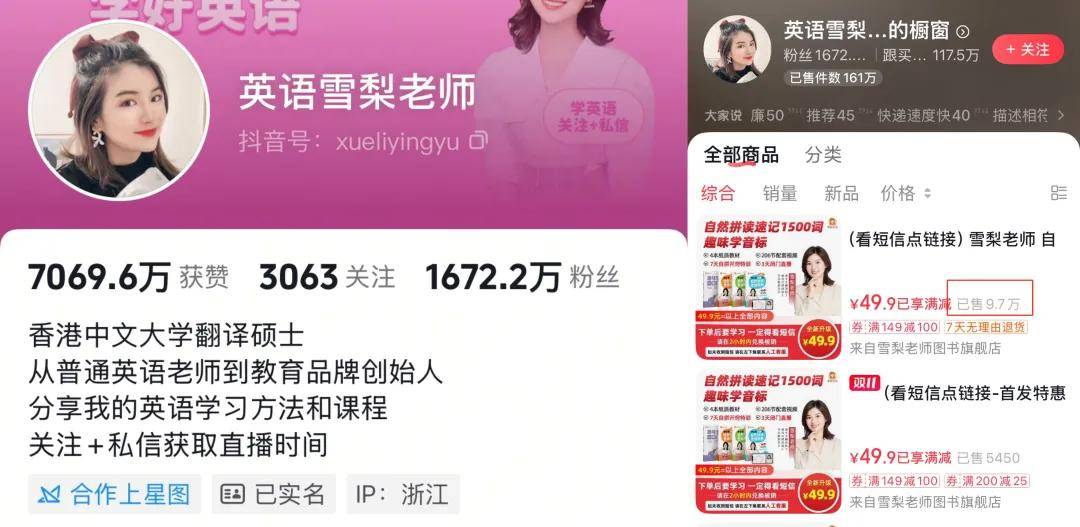 @英语雪梨老师,抖音粉丝1672万,商品橱窗里她的自然拼读课程已经售出9.7万份;