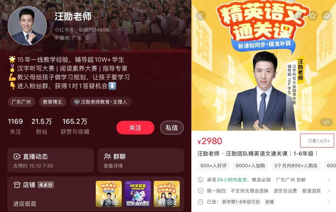 @汪勋老师,小红书粉丝21.5万,语文领域现象级IP,售价2980元的精英语文通关课已经卖出了4172万销售额;