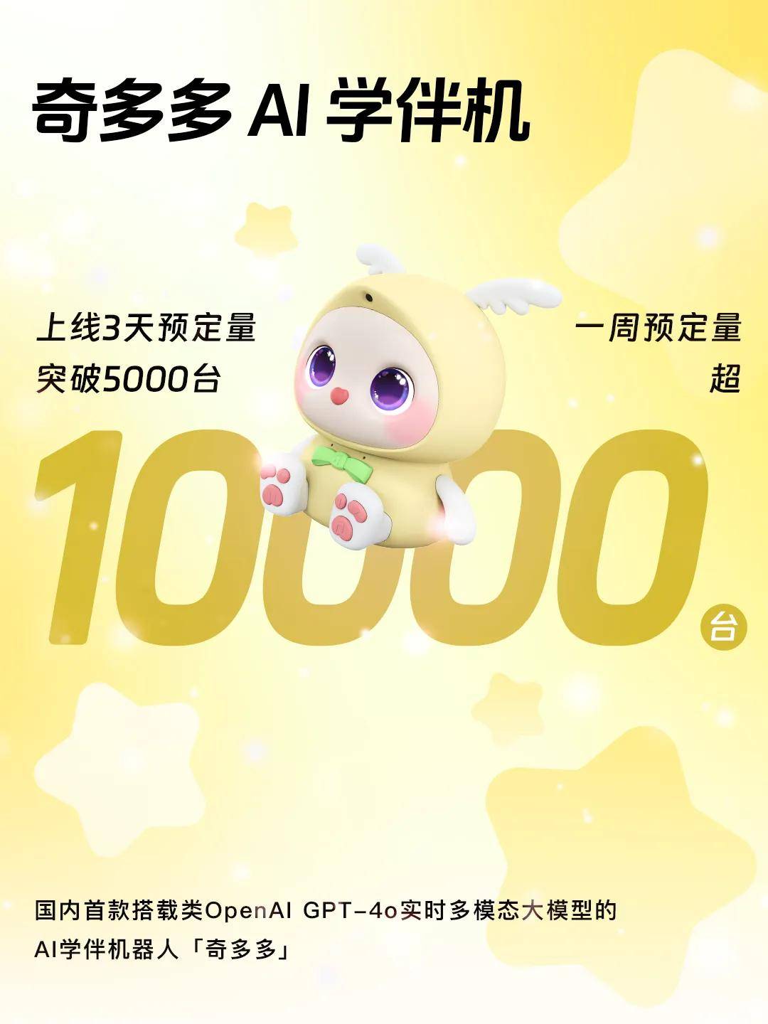 跃然创新去年7月推出的全球首款AI玩具BubblePal,定价389元,一年时间卖了20万台,至今累计销量突破25万台;奇多多星球在今年9月新推出的AI学伴机,在京东上线预售一周,销售量就超过1万台。