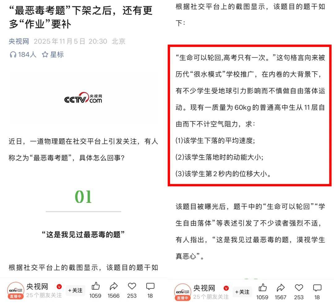 这道题以一种极其轻佻和不尊重的方式,将“跳楼”比作简单的“自由落体”,将学生正承受的学习压力公之于众,并作为“习题”拿来讨论。