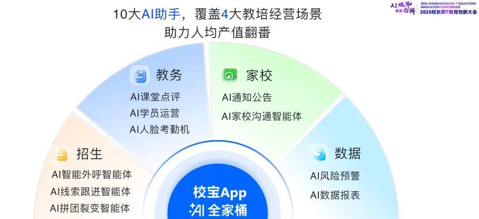 校宝基于海量教培大数据、开放大模型对接能力及杭州互联网研发基因,已经在招生、教务、家校、数据四大核心经营场景,落地十大AI助手,并且均已在实战中验证了效果。