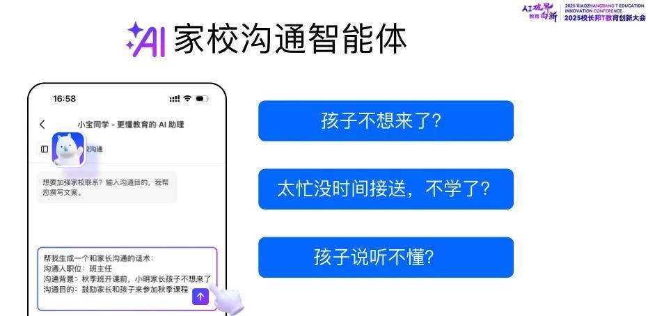 一个是AI家校沟通智能体,核心针对家长们提出的“孩子不想学”、“没时间接送” 等棘手问题,提供一套标准化沟通策略,帮助老师快速应对。