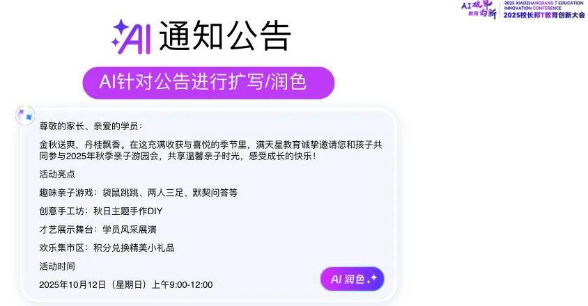 一个是AI通知公告。能基于语义分析自动生成通知,高效触达家长,降低文案撰写时间。
