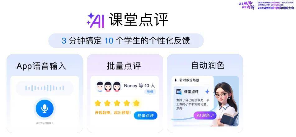 过去老师会花费非常多时间给每个孩子写课评。但通过AI,老师语音输入上课内容和学员关键词(如“调皮”、“认真”),AI就能结合学员历史数据(过往点评、成绩、作品等等),生成个性化课评,还支持批量生成与润色。而且没有AI 痕迹,非常贴合真人表述。