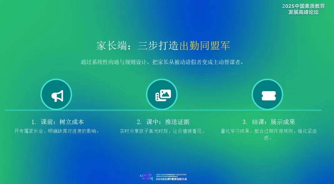 第二个原因,是补课机制不完善。很多老师不喜欢补课,家长请假后,补课时间迟迟定不下来。正确的做法是,请假的48小时内,老师必须主动沟通确定补课时间,同时配套补课券、补课积分等奖励,激励老师主动推进。