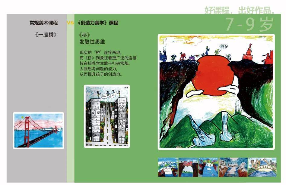 别人教孩子画桥,只关注“像不像、歪不歪”,对老师的手上功夫要求高,但含金量低;杨之光美术20年前就教 “思维类绘画”,让孩子描绘“太阳下山时,和同伴从太阳上走过桥”的场景,培养想象力和创造力。