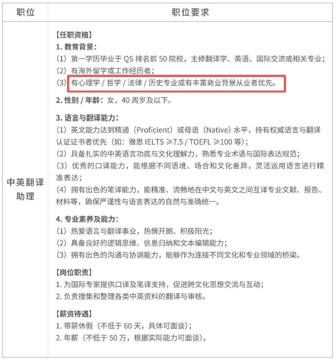 除此之外,胖东来最近以“50万年薪+60天带薪休假”高薪招聘的中英翻译助理,其中一项任职资格就写着“有心理学/哲学/法律/历史专业或丰富商业背景从业者优先”。