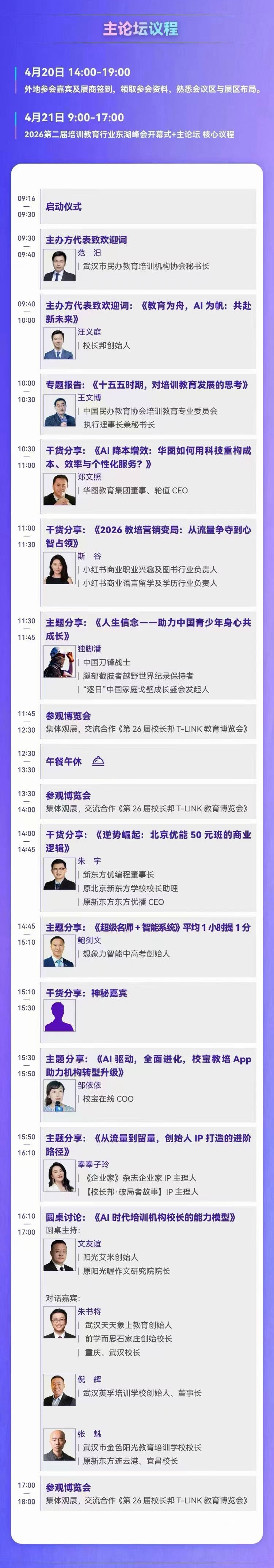 4月21日,本届东湖峰会的主论坛将给出权威政策的精准导航,头部大咖的实战赋能,标杆同行的经验碰撞,还有全行业精英的资源聚合,这不仅是一场行业思想的盛宴,更是教培人破解困局、谋求突破的核心阵地。