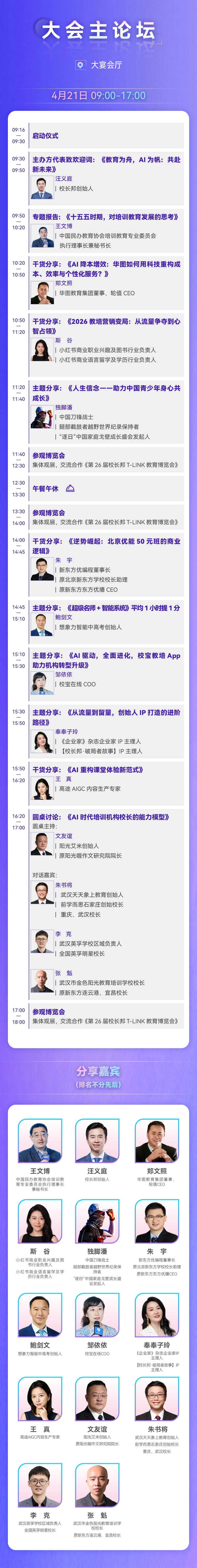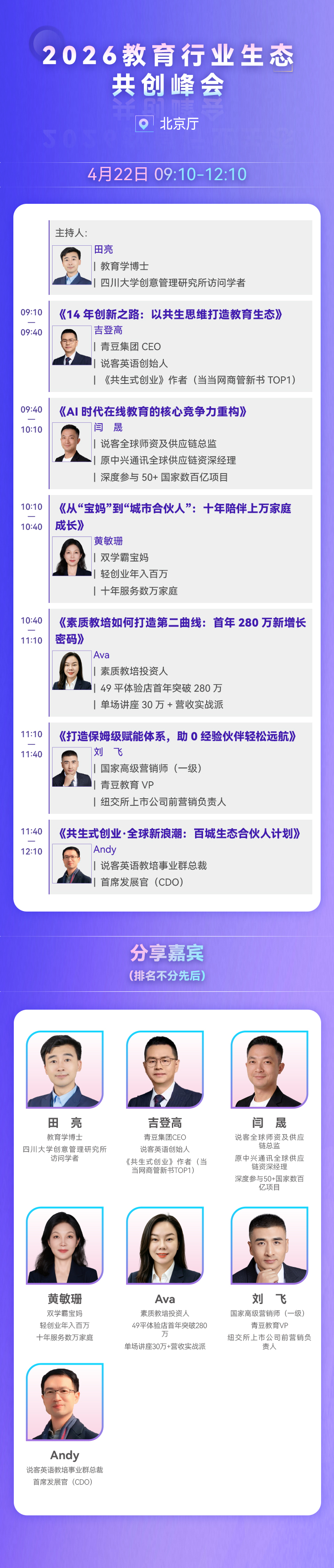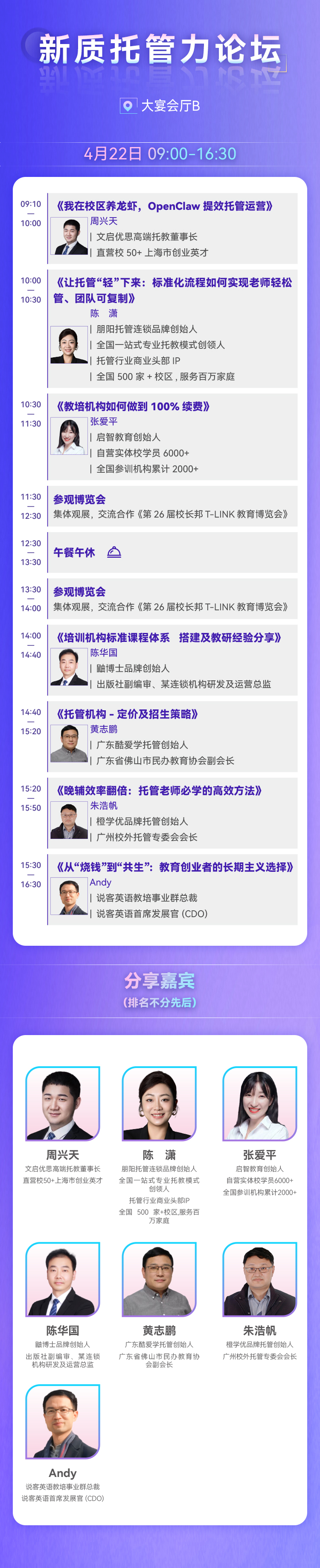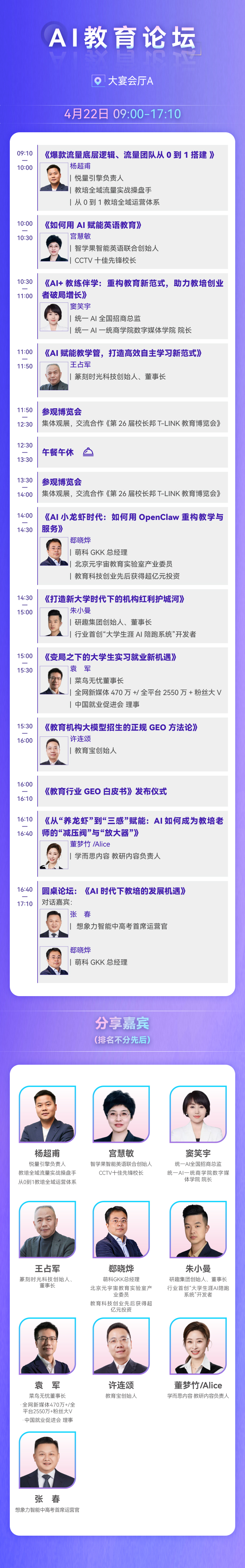 在这里,我们将共同解读2026年行业政策的最新走向,深度学习细分赛道的布局逻辑,探寻构建差异化竞争力的核心路径;同时,也将聚焦OpenClaw、AI Agent等前沿技术,探索其在教培场景中的真实落地。