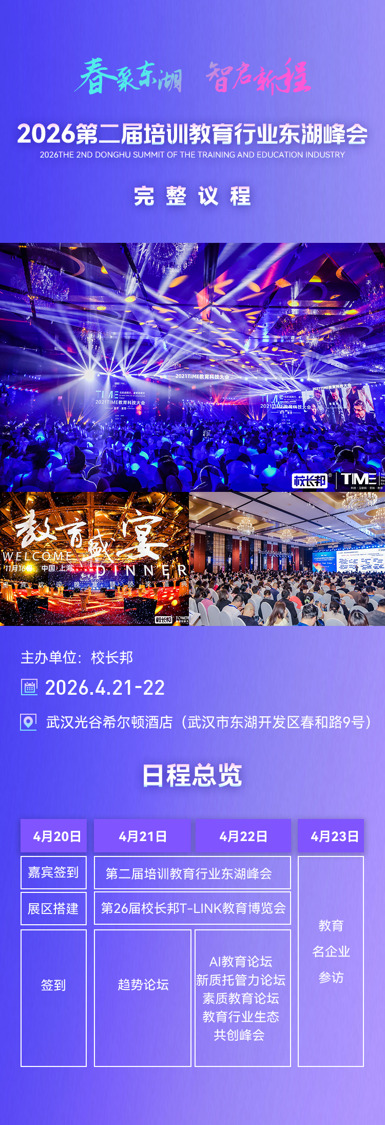 风口之上,顺势而为。2026年第二届培训教育行业东湖峰会,应时而来!2026年4月21日-22日,延续“守正创新·赋能成长”为核心宗旨的2026第二届培训教育行业东湖峰会即将在武汉光谷希尔顿酒店拉开帷幕!