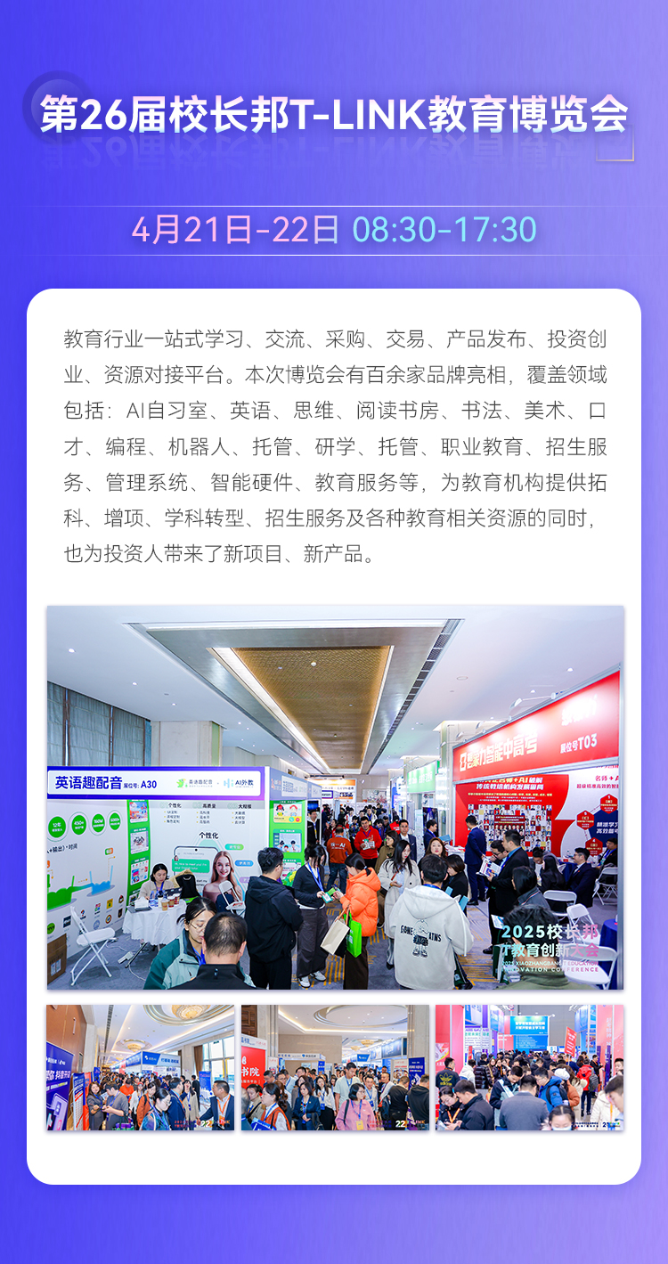 2026第二届培训教育行业峰会将持续2天,同期还将举办汇聚近百余家优质教育品牌的第26届校长邦T-LINK教育博览会。百余位重磅嘉宾齐聚,打造高规格行业盛会。